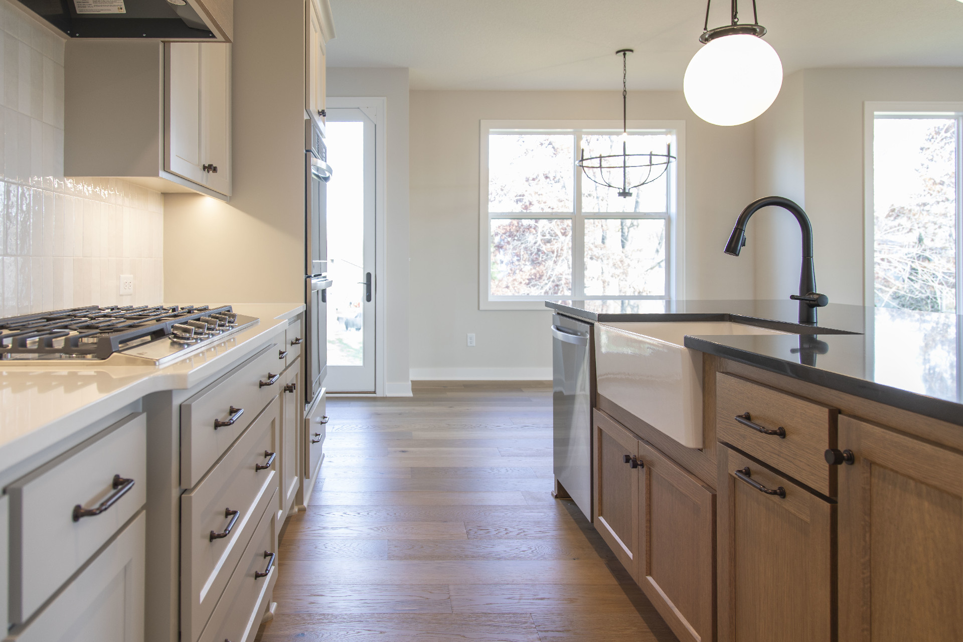 - Elegant kitchen featuring cooktop, double ovens, a spacious island, and many windows for natural light