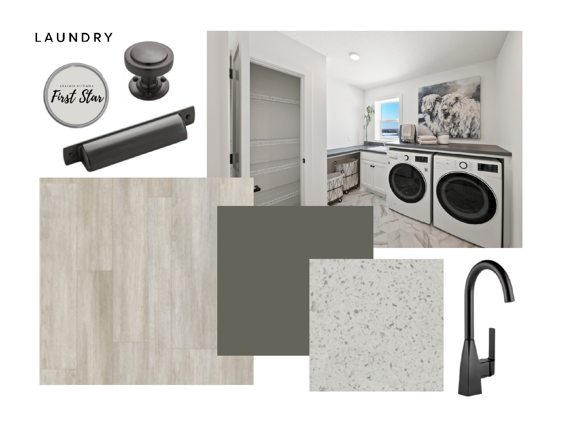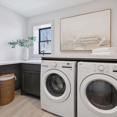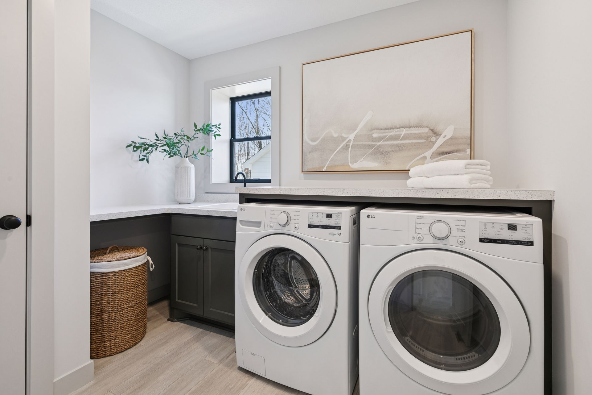 - Laundry has a linen closet, ample folding counter space with sink & faucet and an exterior window