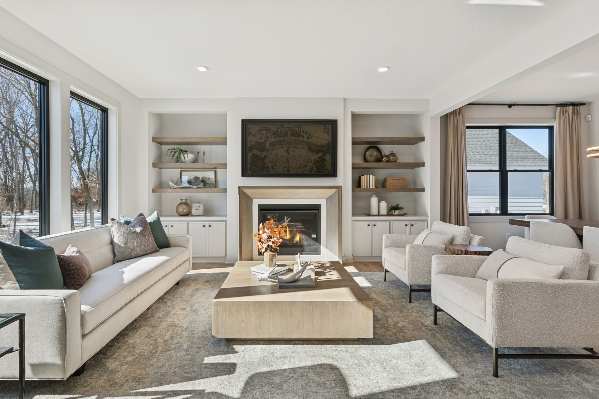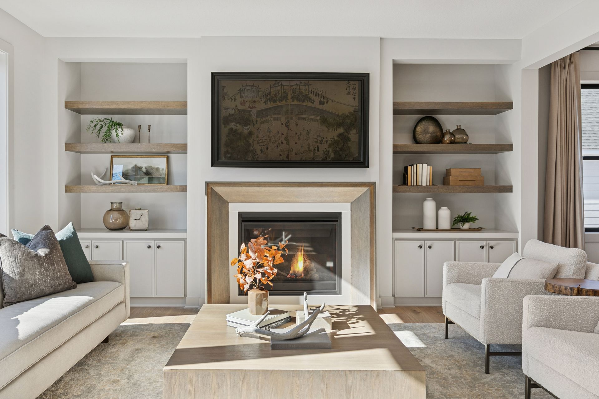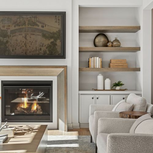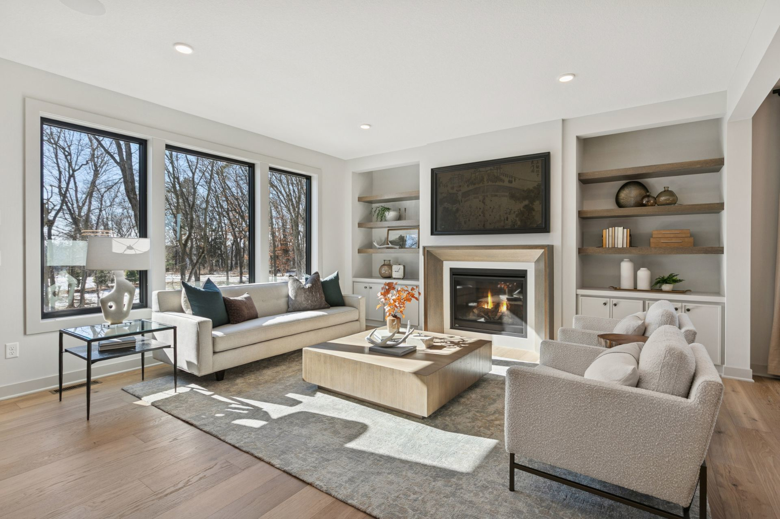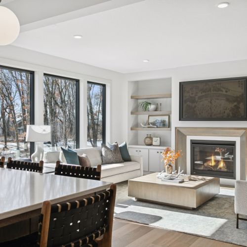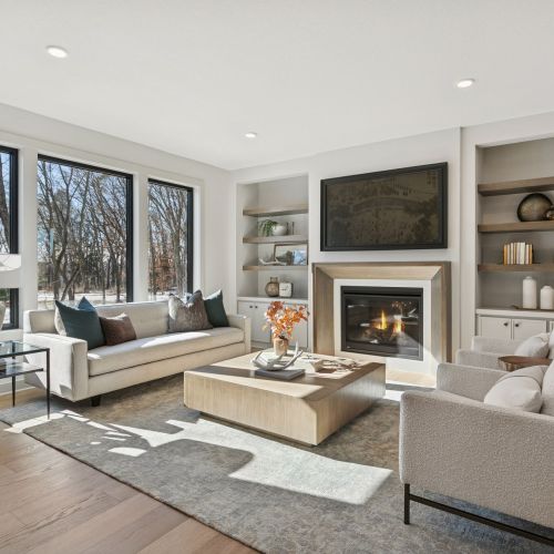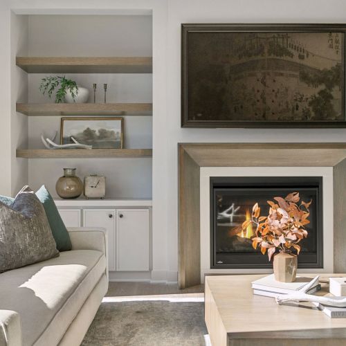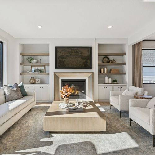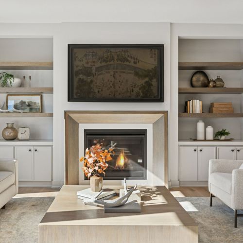 - Great Room features a modern fireplace flanked by custom built in cabinetry & wood shelves