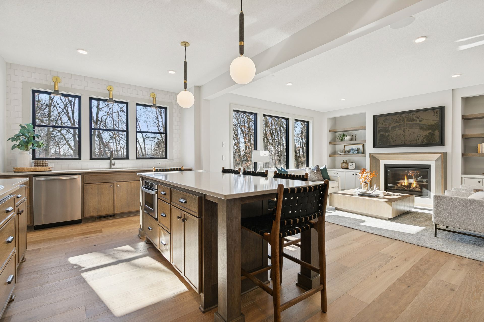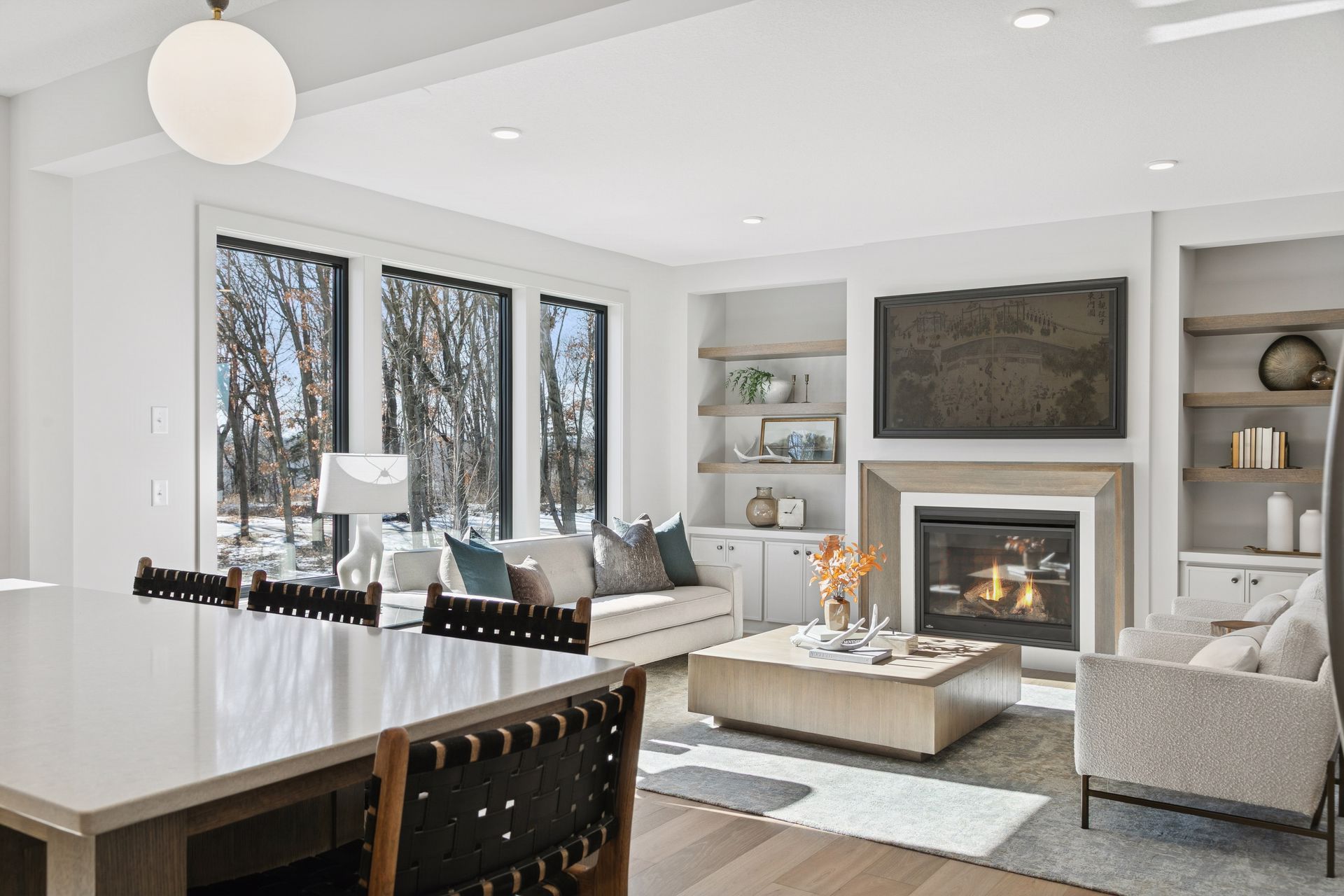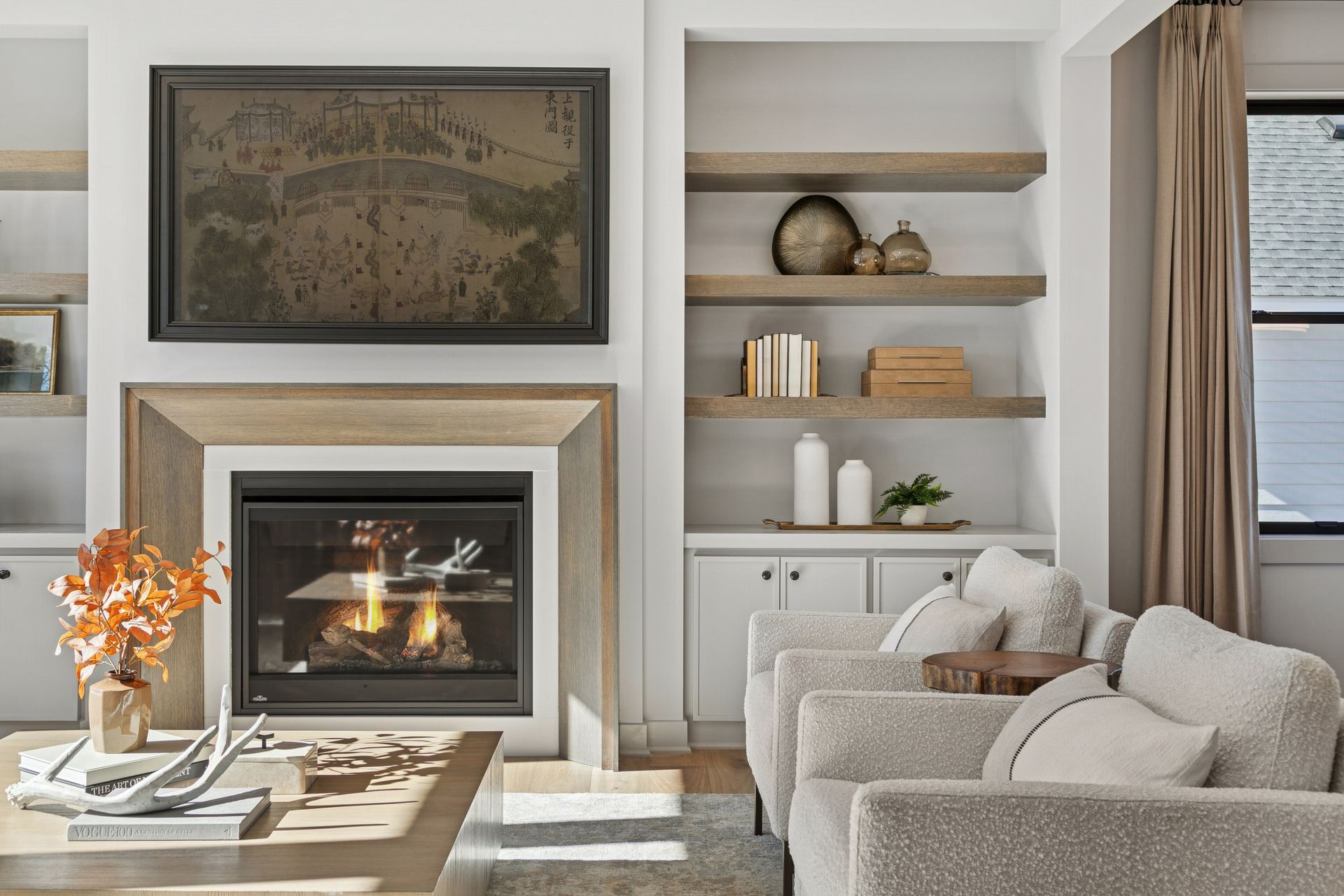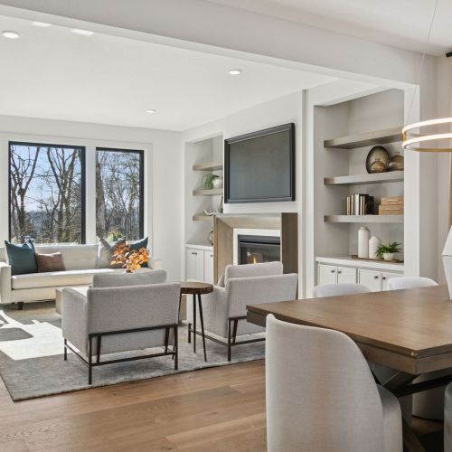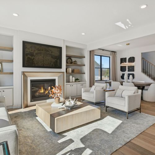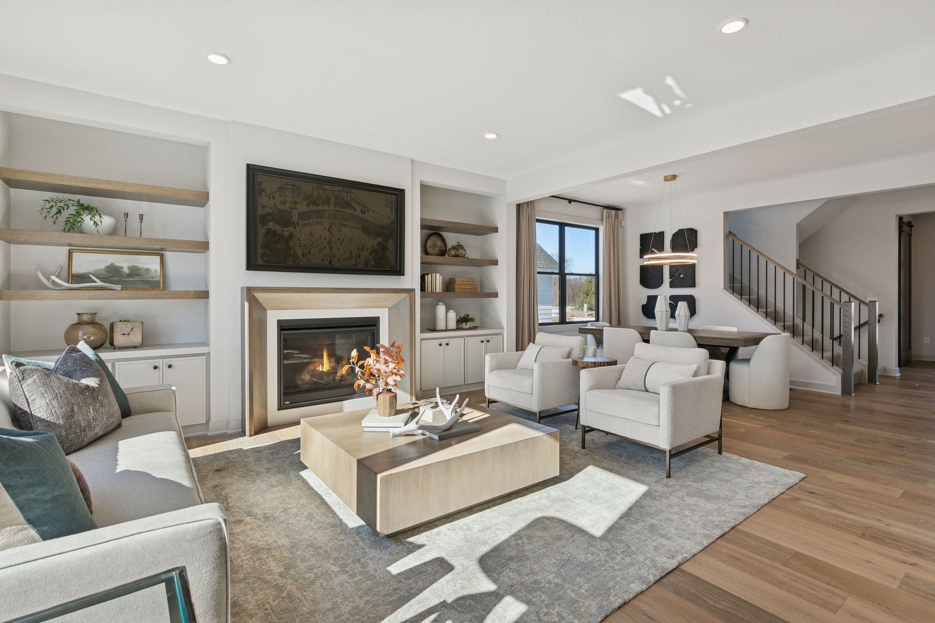 - Great Room features a modern fireplace flanked by custom built in cabinetry & wood shelves