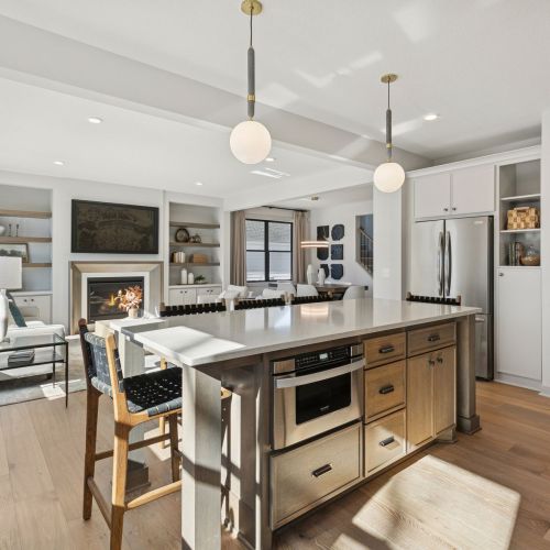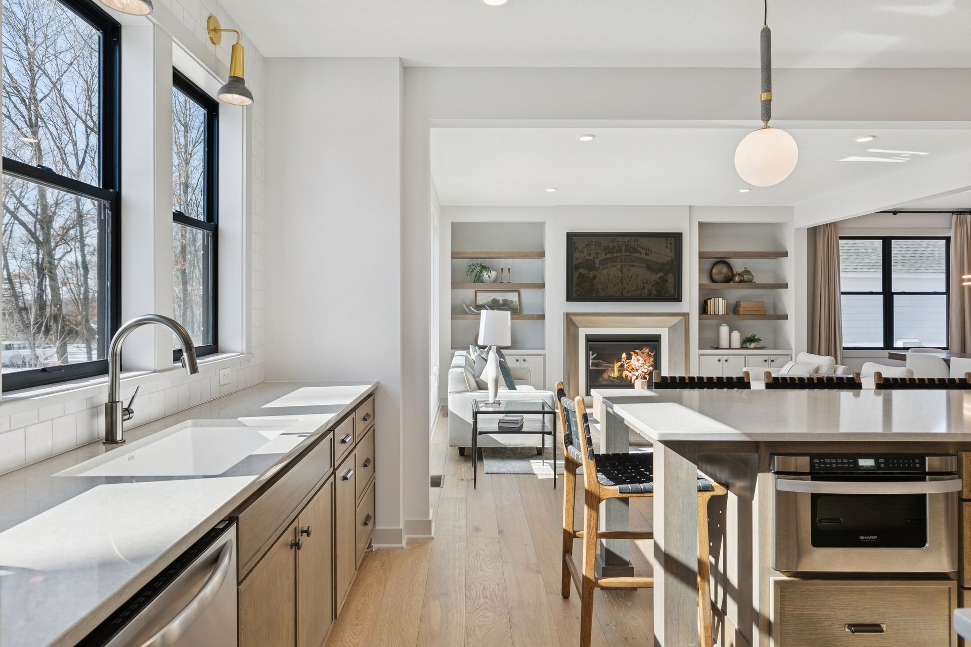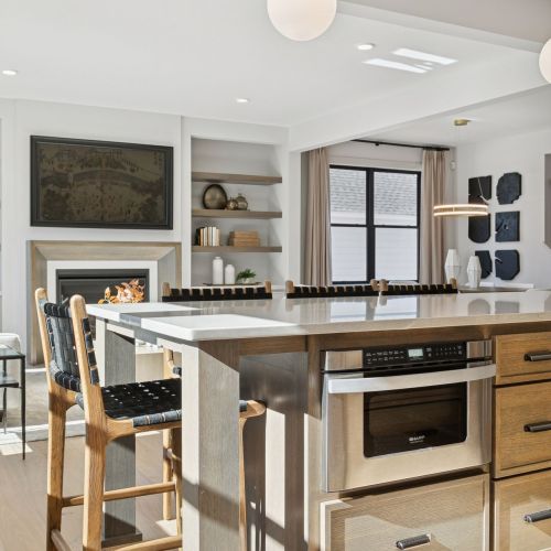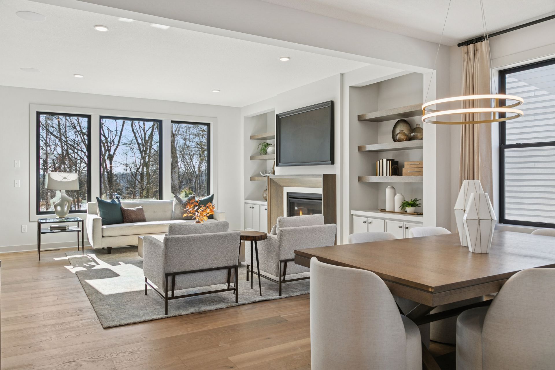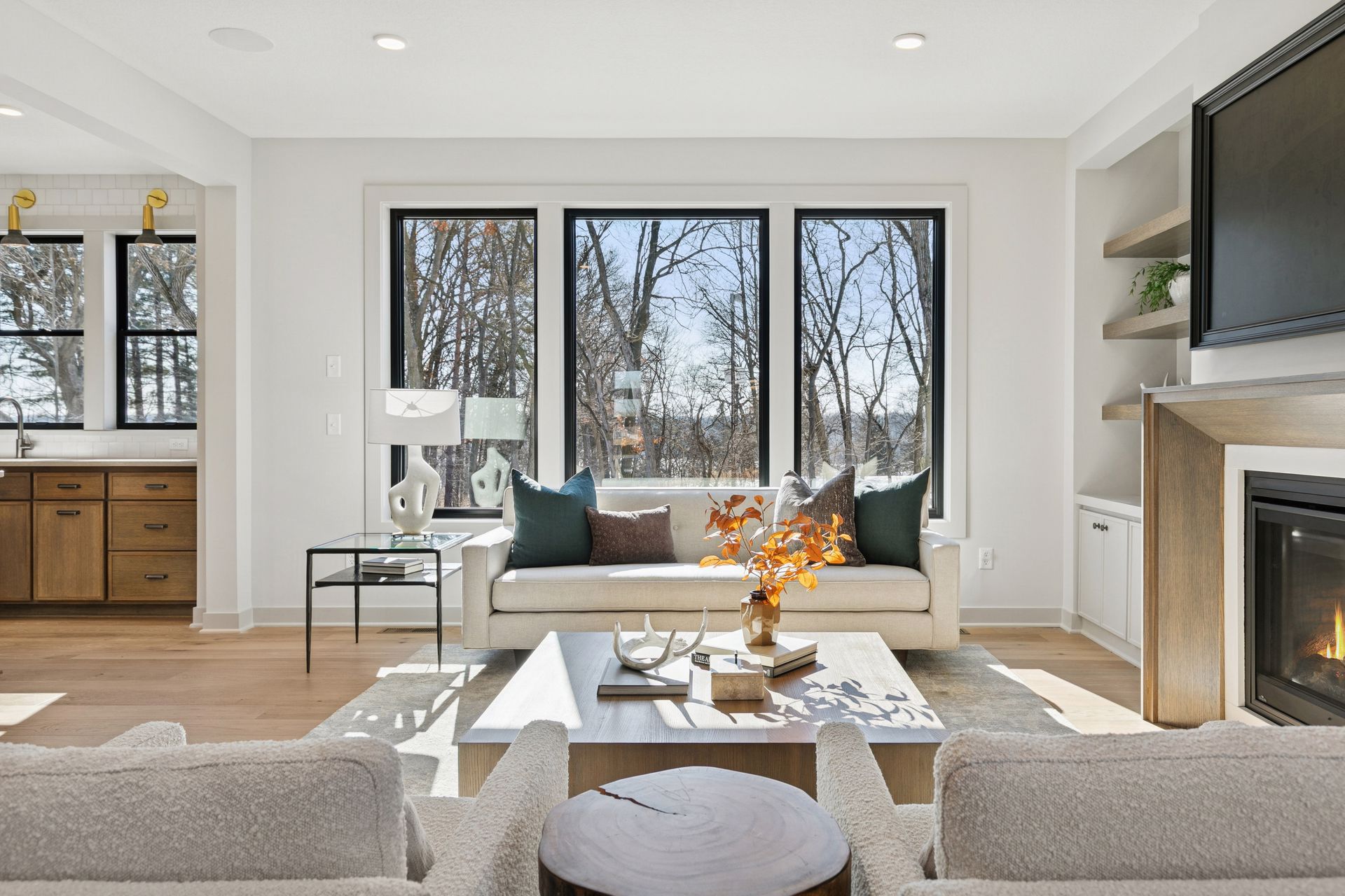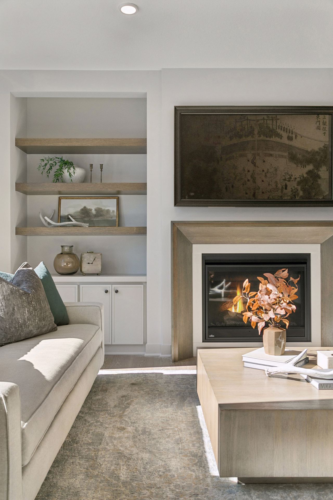 - Great Room features a modern fireplace flanked by custom built in cabinetry & wood shelves