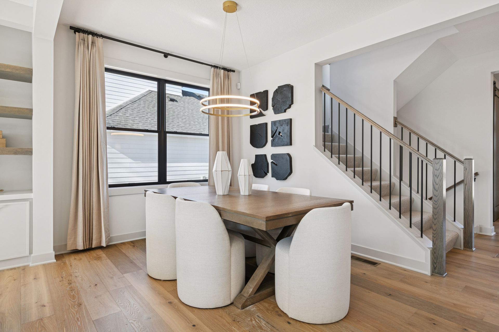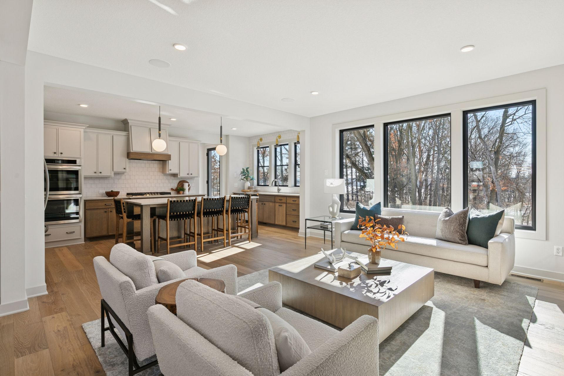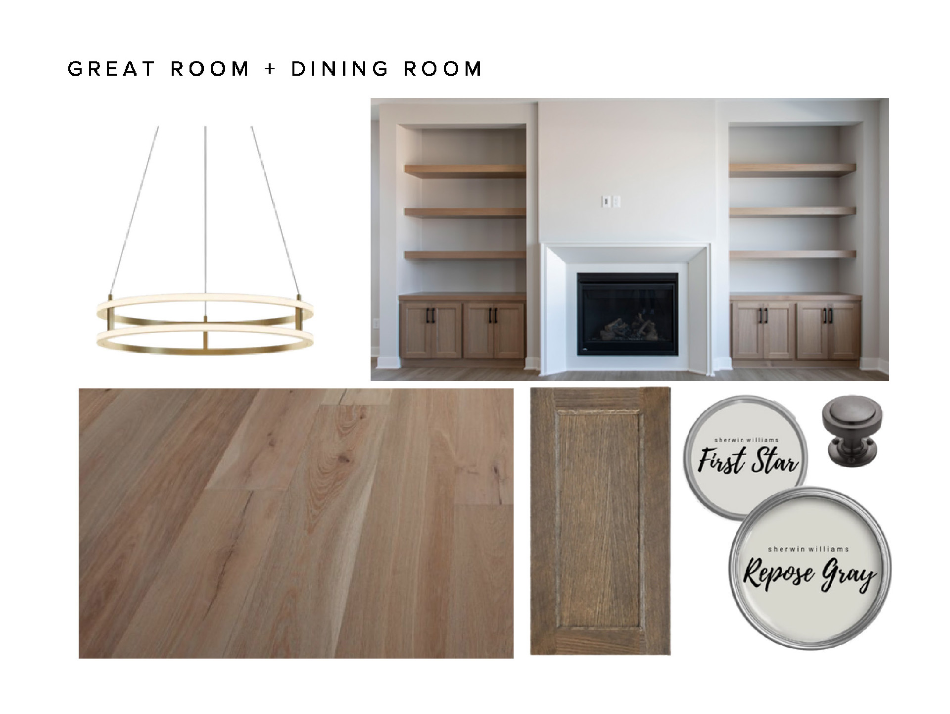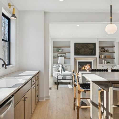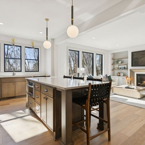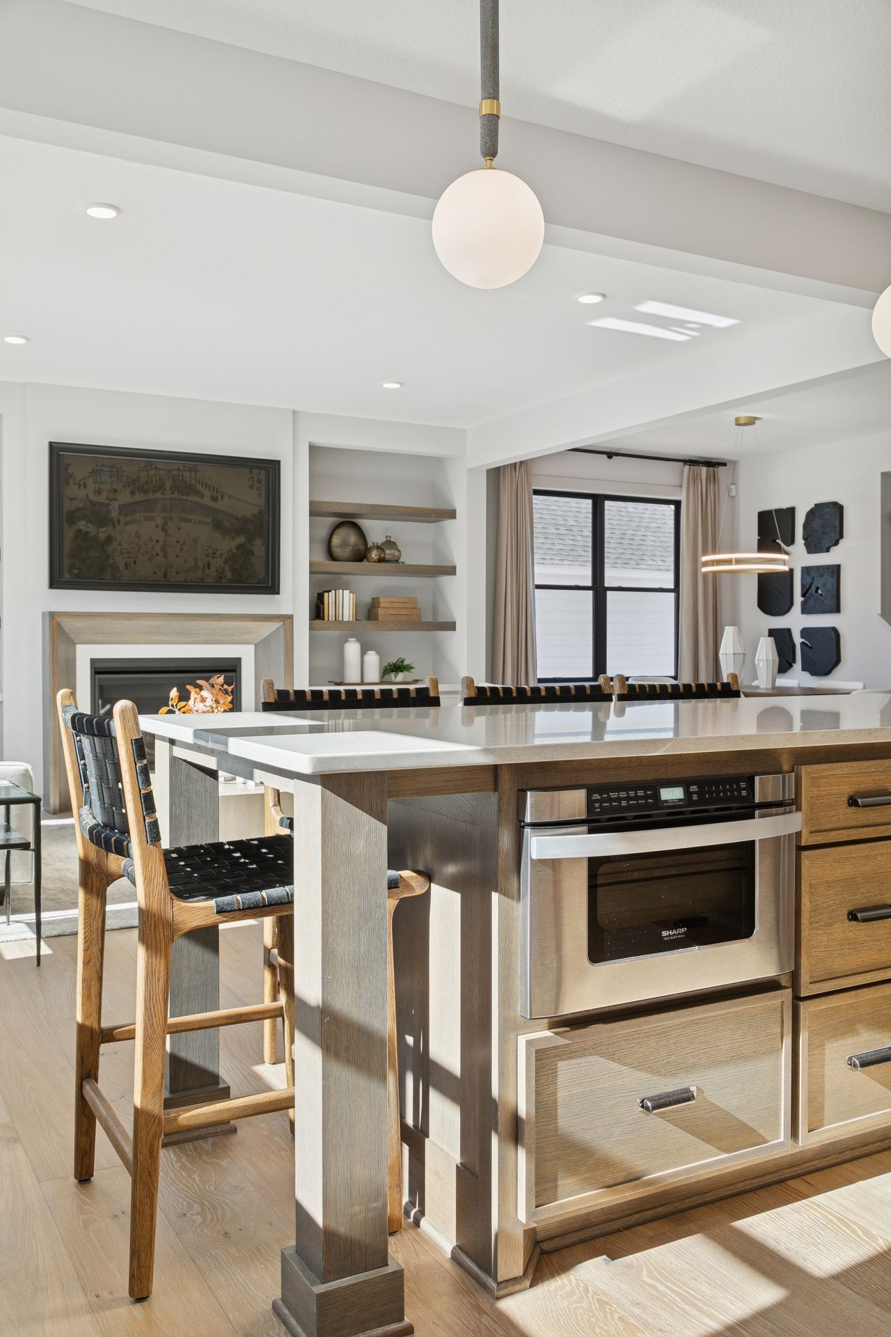 - Great Room features a modern fireplace flanked by custom built in cabinetry & wood shelves