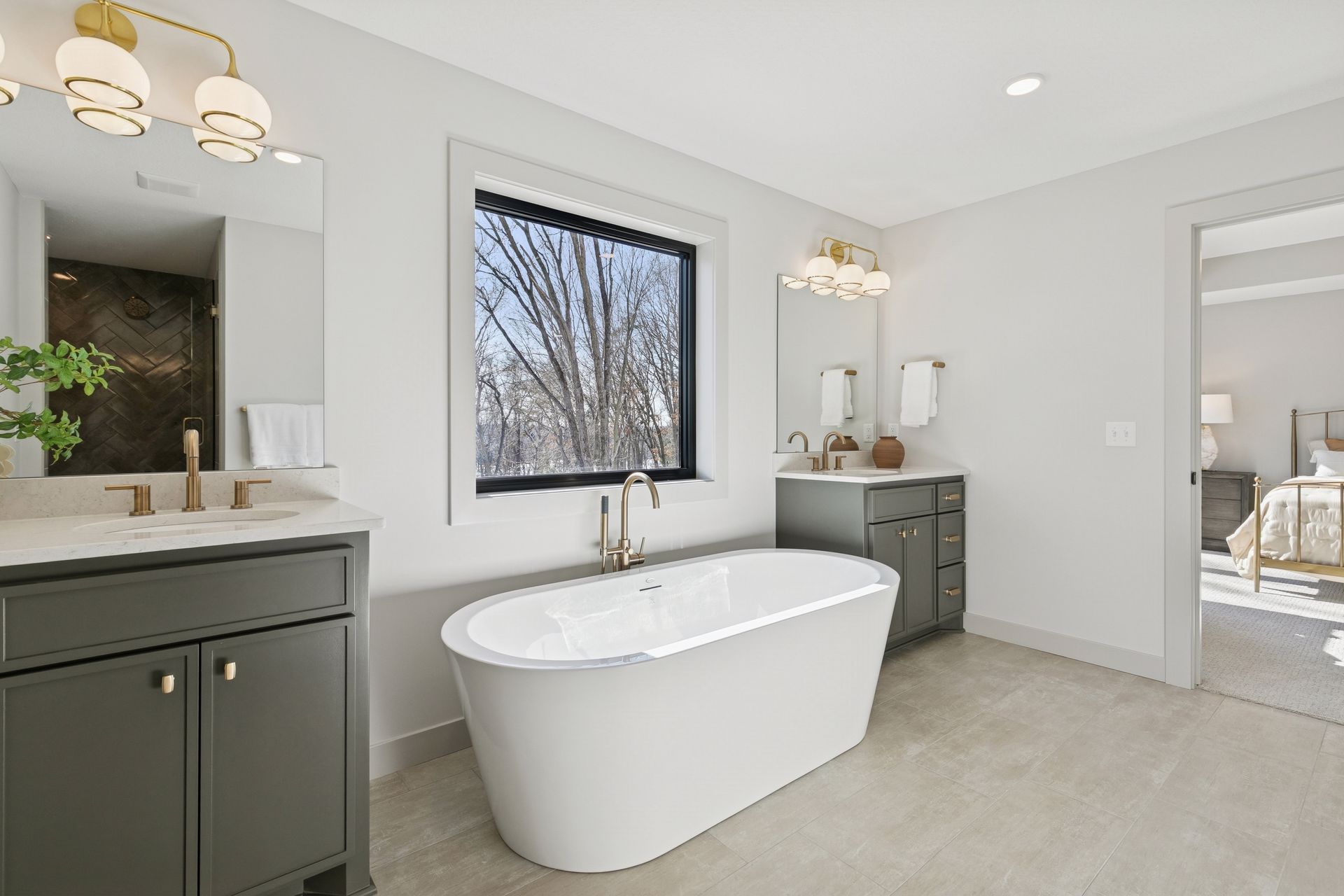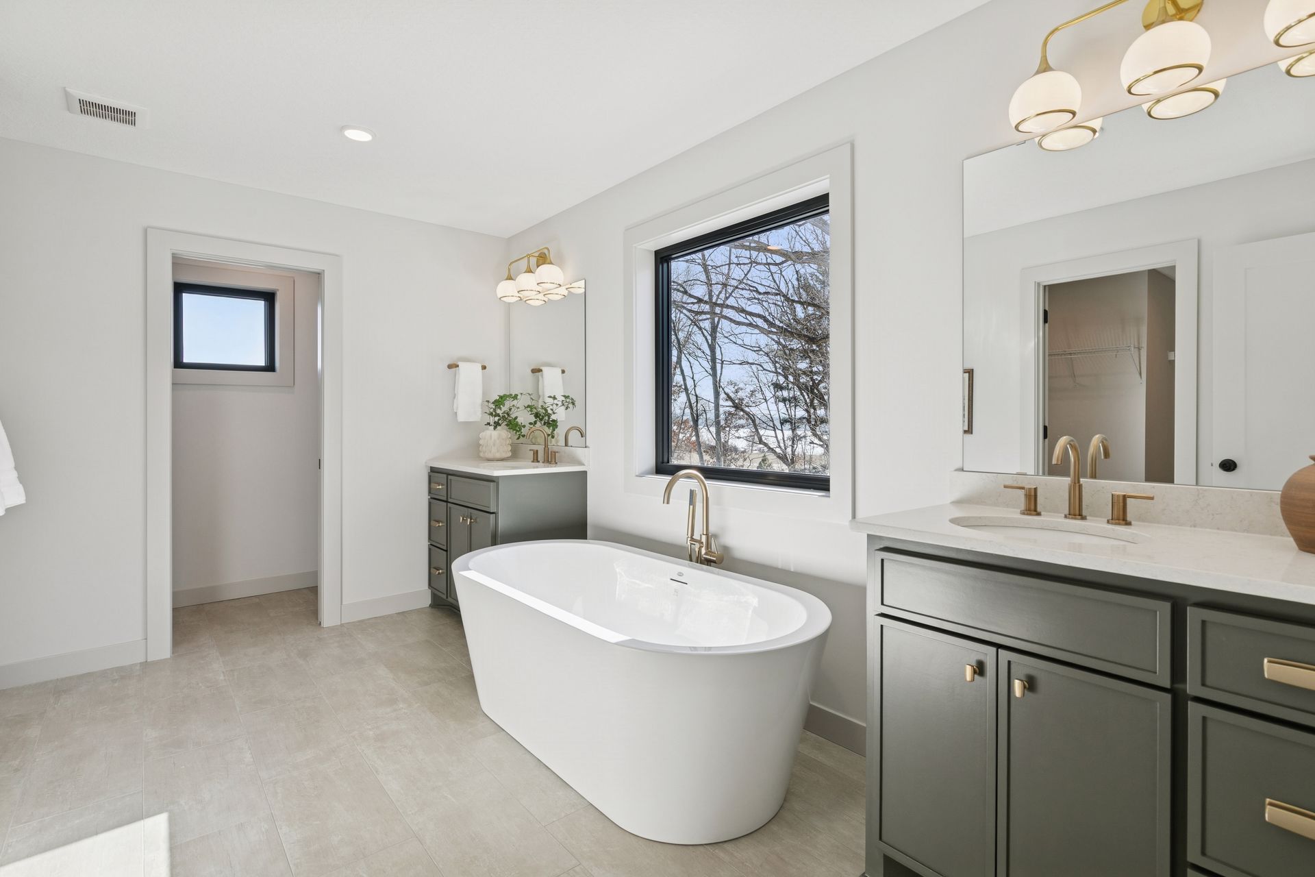 - Owners Bath features his and hers vanities, large spa shower with dual shower heads in addition to free-standing tub
