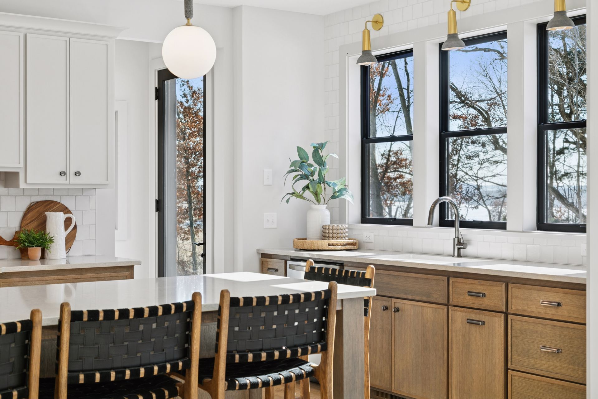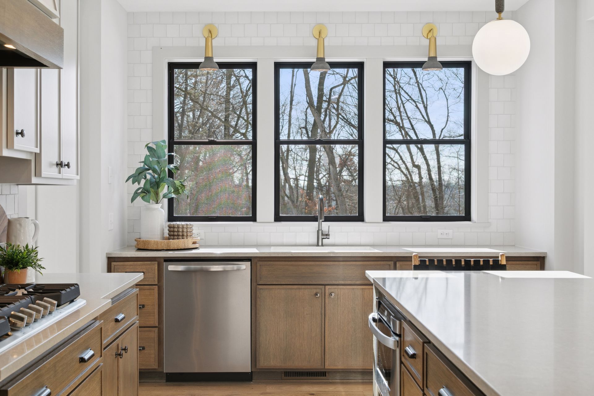- Central Kitchen with bright airy rear views through bank of windows over the sink