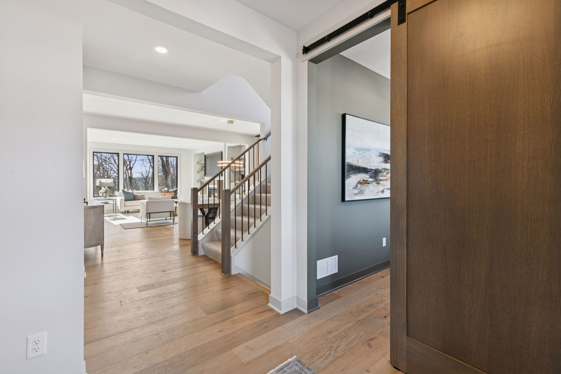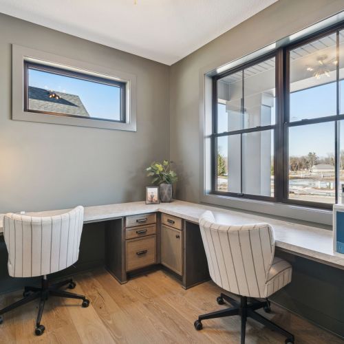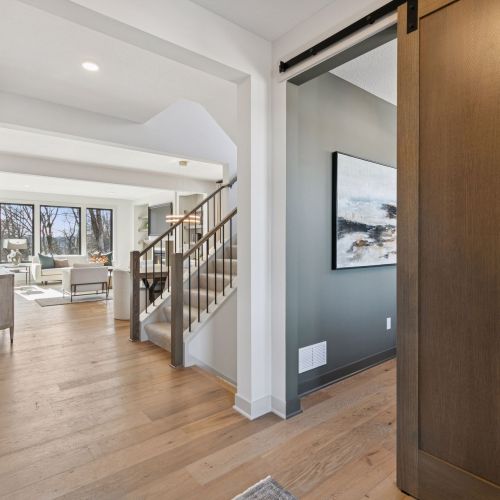 - Working Office with Barn Door & wrap around desk off front entry for receiving clients or deliveries